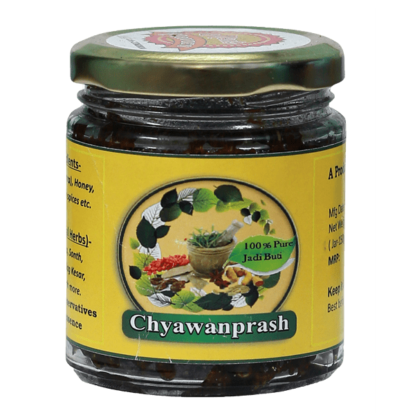 Our Chawanprash is prepared from 31 Herbs(Jadibooti) Like Giloy, Ashwaghandha, Dashmool, Hari-Taki, Nag-Kesar & Vital Bhasams mixed well with 51 Pure Natural Components Like Fresh Amla, Almonds, Saffron, Honey & Cows Ghee which gives Super Concentrated Blend of Nutrient Rich Herbs & Minerals, which aids in imporving Vilatility & Inner Strength.